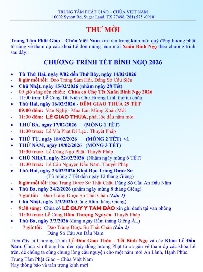 Trung Tâm Phật Giáo – Chùa Việt Nam xin trân trọng kính mời quý đồng hương phật tử cùng về tham dự các khoá Lễ đón mừng năm mới Xuân Bính Ngọ theo chương trình sau đây: