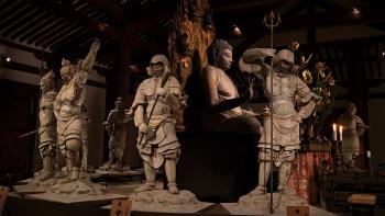 Khi bước vào chánh điện của chùa Shin-Yakushiji ở Nara, bạn được chào đón bởi một loạt các tác phẩm điêu khắc mặc áo giáp nghiêm túc, vẻ mặt đầy giận dữ.