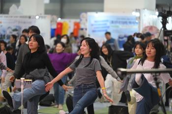 Khách tham quan tham gia buổi tập Seonmudo - một phương pháp thực hành Phật giáo kết hợp giữa vận động và thiền định