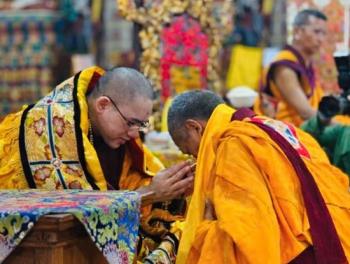 Đức Kadam Kyabje Dongchen Chotrul Rinpoche (bên trái) trong lễ tấn phong vào ngày 17-4-2025 tại Tu viện Jovo Kadampa, Kathmandu, Nepal